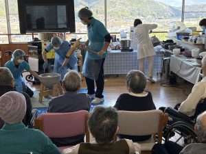 昔、自宅で餅つきやお餅を丸める作業をしたことがある利用者様が多くおられ、数名の利用者様が「お餅をついてみたい。」と言って杵を振り上げ、臼にたたきつける姿や表情は、とても勇ましかったです(^o^)丿